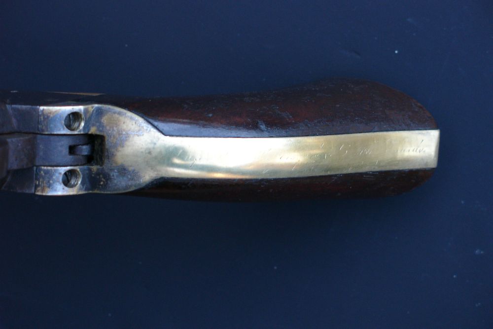 This is a very interesting Colt 1849 pocket percussion revolver with 6" barrel and 5 shot cylinder in .31 caliber. Serial number is in the 187,000 range and was made in 1861. Colt 1849 Pocket revolvers were very popular with both Union and Confederate troops during the Civil War. The near countless numbers of studio photos taken during the war of soldiers proudly wielding their Colt 49's is ample proof of this weapon's popularity. This revolver came from a family about 40 miles East of us near Athens, GA. It was inherited from a father to a son...but we don't have any provenance. However, there is no question this revolver was used in the Civil War. The bottomstrap is nicely inscribed "APRIL 1861". The backstrap also bears an inscription that partially removed a very long time ago. We wondered for quite some time why someone would remove the inscription but keep the presentation date! Was this gun captured from a Union Officer by a Confederate, lifted in camp? Whatever the reason, the new owner did not like the presentation but chose to leave the date perfectly intact. All serial numbers are perfect and intact. Fortunately, Colt backstraps have a slight curvature to them which allowed some of the high and low sections of the engraving to survive. If you study it long enough, you can get a fairly good idea of what almost each word says. The inscription is a presentation to an officer, definitely a Captain, from his friends but I can't quite make out the name. It looks like "Captain ?.?. ??ri?? (Lyris? Pyris?..I can't figure it out) f??? (from) ???(his) G????fu?(Greatful) Friends.. The words Captain and Friends are pretty clear...and the name is about half visible..the rest of the words are in fragments but enough is there to allow for a little deductive reasoning. I think someone who knows engraving bettern than our un-trained eyes might be able to identify who this officer was. If so, you'll have a gun worth considerably more than the selling price. This is one of those guns we run into on occasion that will really get the wheels turning in trying to fill in the blanks of what must have been a great story during the biggest crisis in US History. We contacted the Colt Archives in hope that the inscription was done by the factory. Unfortunately, most inscriptions were done by the dealers who sold the guns directly to their customers. Colt seems to have rarely engraved presentations that weren't from the Inventor himself, Mr. Sam Colt. This gun was no exception and must have been engraved at the store. Still, the letter was still quite interesting and did confirm the time-frame of the April 1861 presentation. The Archives Letter revealed this gun was shipped on March, 5 1861 in an order of 70 guns to Colt's New York Office on 240 Broadway St., NY, NY. This gun shipped from Colt the day after Abraham Lincoln was inaugurated as President of the United States. Samuel Colt was a shrewd businessman and a keen sense for calculating opportunity. He knew a war was coming and did his best to sell his arms to both sides of the forthcoming conflict. As you know, the Southern states had threatened to secede from the Union if Lincoln was elected President. The following is a brief time-line we borrowed from another website showing the events that this gun seems to have been a part of during those first tumultuous months of 1861: January 1861 -- The South Secedes. When Abraham Lincoln, a known opponent of slavery, was elected president, the South Carolina legislature perceived a threat. Calling a state convention, the delegates voted to remove the state of South Carolina from the union known as the United States of America. The Secession of South Carolina was followed by the secession of six more states. January 9 - Mississippi seceded from the Union. January 10 - Florida seceded from the Union. January 11 Alabama seceded from the Union. January 19 Georgia seceded from the Union. January 26 Louisiana seceded from the Union. January 29 Kansas admitted to the Union. February 1 Texas seceded from the Union. February 1861 -- The South Creates a Government. At a convention in Montgomery, Alabama, the seven seceding states created the Confederate Constitution , a document similar to the United States Constitution, but with greater stress on the autonomy of each state. February 1861 -- The South Seizes Federal Forts. When President Buchanan -- Lincoln's predecessor -- refused to surrender southern federal forts to the seceding states, southern state troops seized them. At Fort Sumter, South Carolina troops repulsed a supply ship trying to reach federal forces based in the fort. The ship was forced to return to New York, its supplies undelivered. March 4 1861 -- Lincoln's Inauguration . At Lincoln's inauguration the new president said he had no plans to end slavery in those states where it already existed, but he also said he would not accept secession . He hoped to resolve the national crisis without warfare. March 5, This Colt shipped to Colt's New York Office March 11 1861-- Confederate Constitution . April 1861 -- Attack on Fort Sumter . When President Lincoln planned to send supplies to Fort Sumter, he alerted the state in advance, in an attempt to avoid hostilities. South Carolina, however, feared a trick. On April 10, 1861, Brig. Gen. Beauregard, in command of the provisional Confederate forces at Charleston, South Carolina, demanded the surrender of the Union garrison of Fort Sumter in Charleston Harbor. The Garrison commander Anderson refused. On April 12, Confederate batteries opened fire on the fort, which was unable to reply effectively. At 2:30 p.m., April 13, Major Anderson surrendered Fort Sumter, evacuating the garrison on the following day. April 17 Virginia seceded from the Union. April 1861-- Four More States Join the Confederacy. The attack on Fort Sumter prompted four more states to join the Confederacy. With Virginia's secession, Richmond was named the Confederate capitol. May 6 Arkansas se