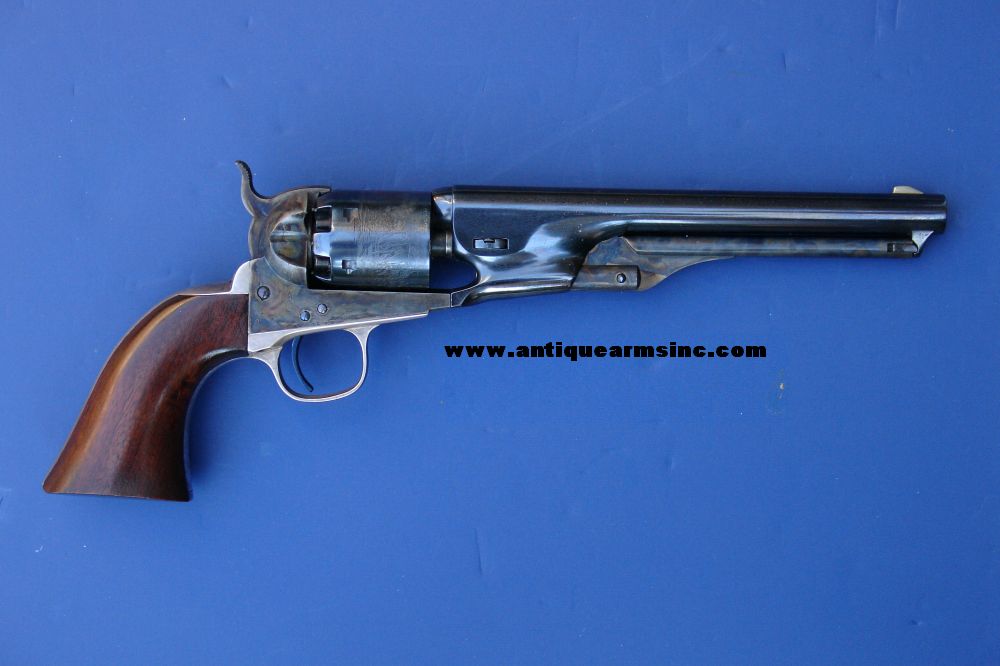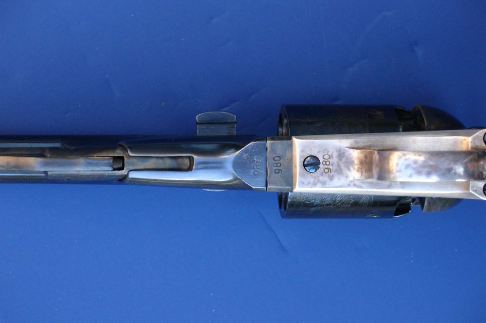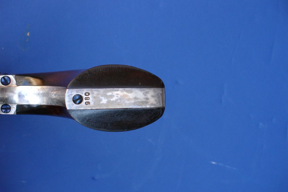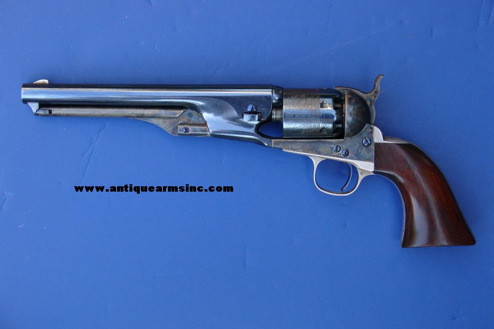 This is an early Model 1861 Revolver in .36 Caliber in fantastic condition. First year production, the serial number is in the 900 range with all matching numbers. It was restored back to New condition by Colt 50-60 years ago and is just beginning to show a little ago on it...making it look almost like a mint original. Its our understanding that Colt restored many models from around 1946 up through the mid-1950's, after which, they only restored the 1873 Single Action Army revolver. We recently sold an 1860 Colt Army that was identical to this gun and was also restored by Colt during this 1946-1955 timeframe. Overall, its in NRA Antique Near Mint condition as restored retaining 98% bright original barrel blue with a little freckling. Excellent barrel address and Colt's Patent marking on left side of the frame. The cylinder has 95% bright blue with perfect cylinder scene with the balance starting to haze over to a light brown patina. The frame, hammer and loading lever show 98% bright case colors. Triggerguard and backstrap have 100% silver plating intact with no wear...and are starting to tarnish slightly. Screws retain all of their fire blued finish. Action works perfectly and cylinder retains all 6 safety pins. The grips are flawless with no marks or scratches and retain 100% varnish. The wood to metal fit is perfect! An original in this condition would cost well over $20K in today's market. This one is every bit as nice as restored by Colt with the quality and workmanship of an original. A fabulous example of an 1861 Colt Navy! Item# 0512 SOLD |