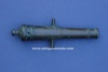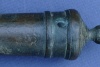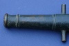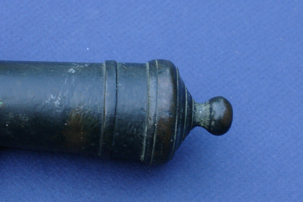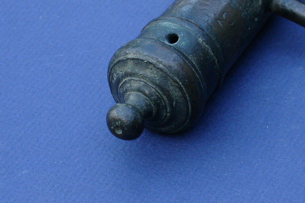This is a small bronze signal cannon that seems likely to have been used on a ship. While I'm far from an expert on cannons, its form appears to be mid-18th century. Measures 7" long with a .40 caliber bore. No carriage but trunnions are intact. There is a number "3 2" located on top of the barrel. Otherwise, no markings but wonderful form....it looks almost as though it belongs to the leg of a table or fine piece of furniture as much as a cannon. Just look at the breech with its steps and nicely stepped enforcement rings. Given the style and font of the numerals, this appears to be the product of an English maker.