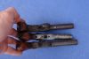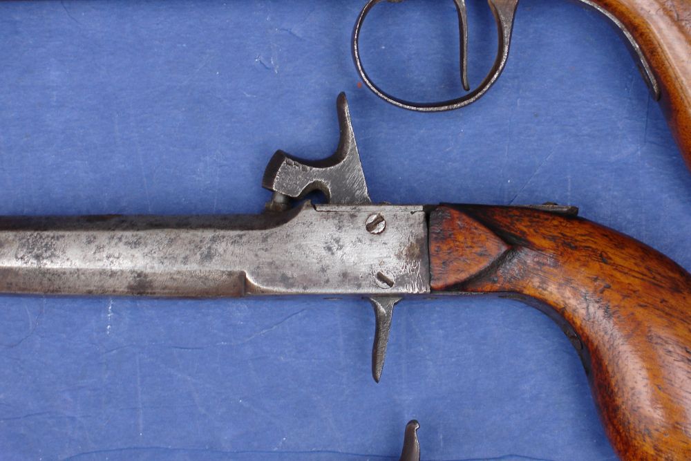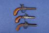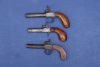 These are three old circa 1840-1860s percussion single shot boot pistols. These little pistols were quite popular with soldiers during the Civil War as quite a number of period photos exist with them braced across their owners during the War. They are not in the best of shape...all need work in some form or another. Two work mechanically, one has a broken mainspring. Two appear to be Europeanm (one has Belgian Liege proofs), one possibly American. One is missing its trigger guard. All need a screw or two either added or replaced. Two are octagon barrel. Two appear to be smooth bores...the Belgian one is rifled. These would make good repair projects and/or placed in a shadow box within a Civil War dislpay. These are sold strictly AS-IS and very cheap! Please, no exports, no layaways, and no returns.