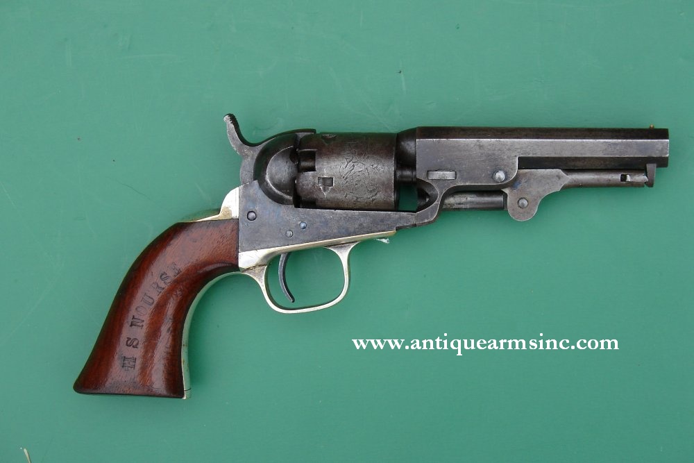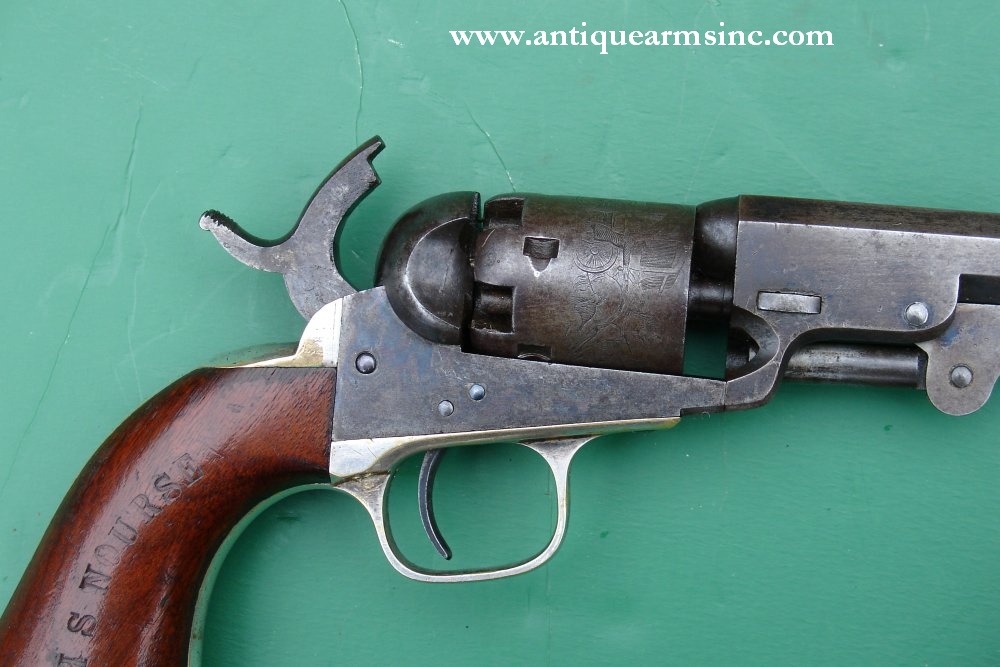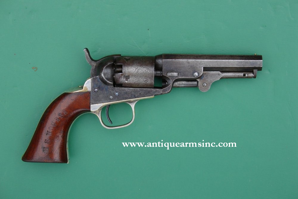 This is a unique little Colt Pocket Percussion Revolver. It was made right at the outbreak of the Civil War. The serial number is in the 178,000 range which puts it right there in one of the most tumultuous moments in American history...between late 1860 - April 1861. The vast majority of Colt revolvers produced during this time-frame were purchased by men heading off to war, with many guns made prior to April 1861 purchased by the South. What makes this one unique is that it bears the names of two soldiers who fought in the Civil War. Otherwise, it's a standard model with 4" octagon barrel, .31 caliber with 5-shot cylinder. 100% all matching numbers throughout including the barrel wedge and walnut grips. It also has a desirable Hartford marked barrel address. As the winds of war began to stir in the months leading up to the Civil War...Sam Colt was shipping many of his guns to the South. Around this time Colt is believed to have changed the Company address on his guns from "New York City" where its sales office was headquartered...to the factory address in Hartford, CT in an effort to appease his Southern pro-slavery customers. The reason, as we understand it, was that many Southerners viewed NYC as the epicenter to the abolitionist Movement. After Lincoln's election in November 1860, Southern purchases seem to have intensified right up to the outbreak of the war in April the following spring. However, once the war began and the South officially became the enemy, Colt quickly changed his barrel addresses back to New York City. Love or hate him, Colt certainly understood the sentiments of his customers on both sides of the Mason-Dixon Line and he worked hard to fulfill their needs.