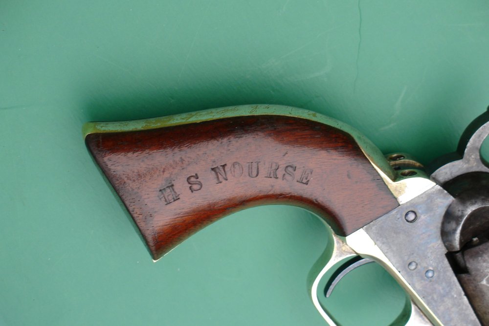 One was Herbert S. Nourse and/or "Nurse" who was a Fifer in 100 day unit from Wisconsin in 1864. Then there was a Henry S. Nourse who was a private of the 72nd Indiana...This regiment formed in the late summer of 1862. The third and most likely candidate/former owner of the this Colt was Captain Henry Stedman Nourse of the 55th Illinois Infantry. Muster roles also specifically mention him as "H.S. Nourse" which is exactly how the name is stamped on the grips. The records for the other two soldiers do not list their names by "H.S. Nourse". Furthermore, being an officer, Nourse would have seemed the more ideal to have had access or owned a set of stamps to place his name on his personal property. After all, officers traveled with foot lockers full of personal items that were often stamped or stenciled with their names. In contrast, enlisted men had to carry their few meager possessions on their backs. They rarely had the means to purchase personal stamps nor did they (unlike officers) possess enough access baggage requiring ID's to warrant such a possession. That said, we felt the most likely owner of this Colt was Henry Stedman Nourse of the 55th IL.