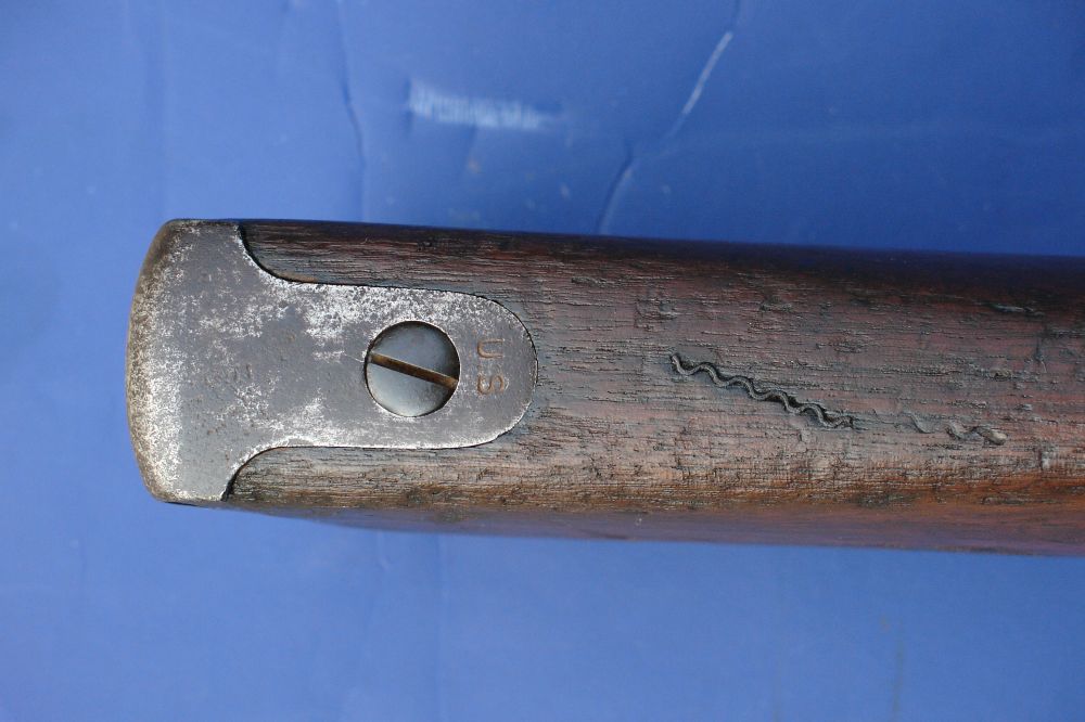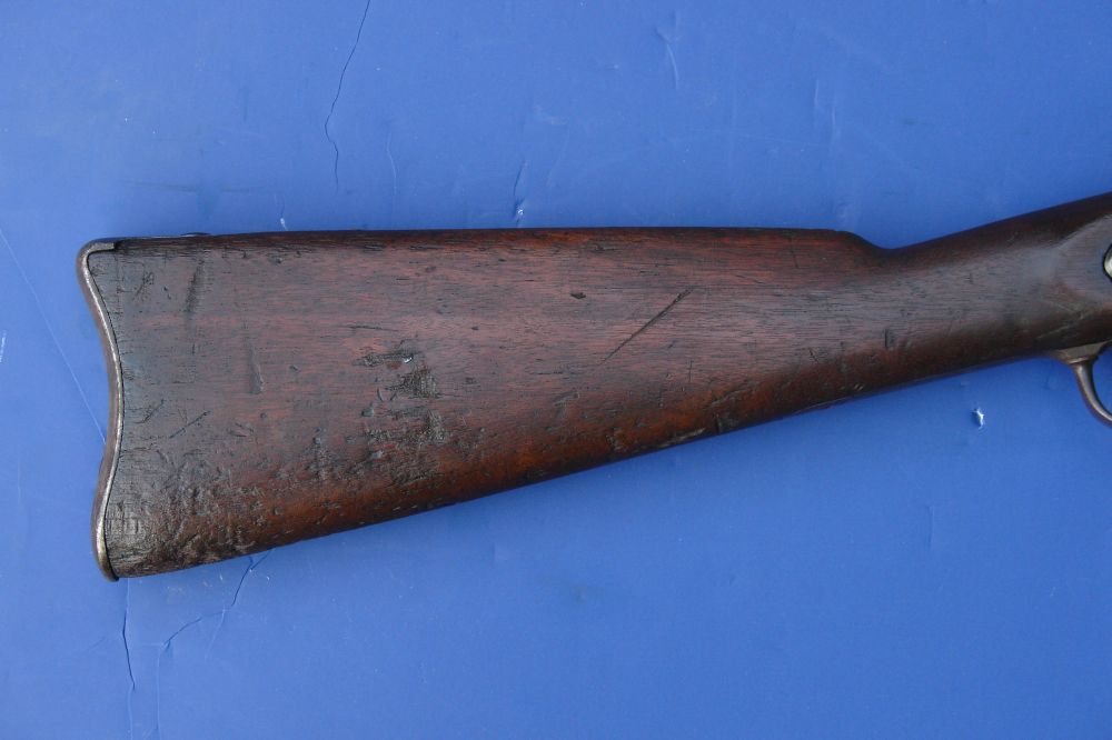 This is a fairly decent example of a Civil War 3 band Colt 1861 Rifled Musket. Its still in its original .58 Caliber with 3 groove rifled bore with a 40" round barrel. Overall, the rifle is in NRA Good condition with the metal mostly turned to a mostly smooth brown patina. The bore is surprisingly still pretty good with all of the 3 groove rifling intact. The action functions as well at both half and full cock positions. The lockplate is dated 1864 with the Colt name in front of the hammer. As on most Civil War vintage muskets, there are some light pits on the breech and bolster areas and some slight burn-away on the wood from powder flash just behind the hammer...however the barrel mfg date is still somewhat visible. Like the lockplate date, it appears to also read "1864". Good clear "US" gov't markings on the lockplate and top toe of the buttplate. The bolster has an Eagle along with a VP and Eagle stamped on the other side of the breech. Below the proofs is the word "STEEL" and inspector's initials "JLC". Various inspector letters can be found on numerous components of this rifle as well. This rifle still has its original front and rear sights. The rear sight is missing the lower leaf and has an incorrect screw securing it to the barrel....looks like an original hammer screw which are pretty hard to find. The ramrod is also a bit of mystery....I believe this could be the original rod but it has a Civil War period blacksmith forged head...I suspect it was damaged and repaired. The stock shows a fair amount wear with numerous dings, gouges, and handling marks but its solid with good wood to metal fit that isn't undersized. Most importantly, the left side of the stock still has its original inspector cartouches...one is light but almost completely legible while the other is partially visible. There are a few things in the wood...some small tack heads, a very old staple, and a couple of those wavy staples you see sometimes in picture frames. I guess these could be removed but they look like they've been there for many years. This stock isn't going to win any beauty contests but its original, solid, has never been altered or cut, the cartouches are there, and it hasn't been sanded down so its still wearing all of its Civil War service history. All in all, not a bad example of Colt 1861 Special Contract.