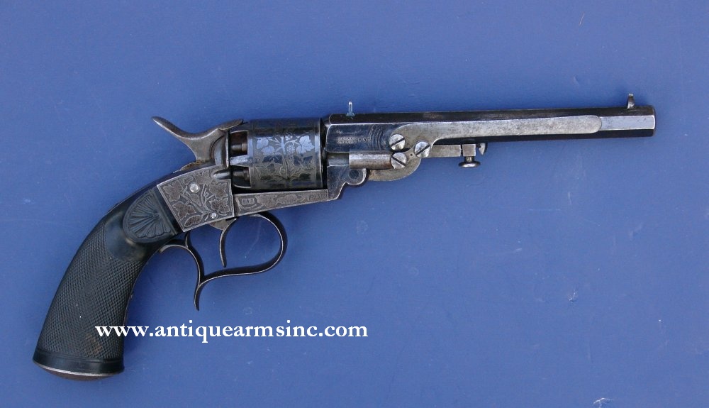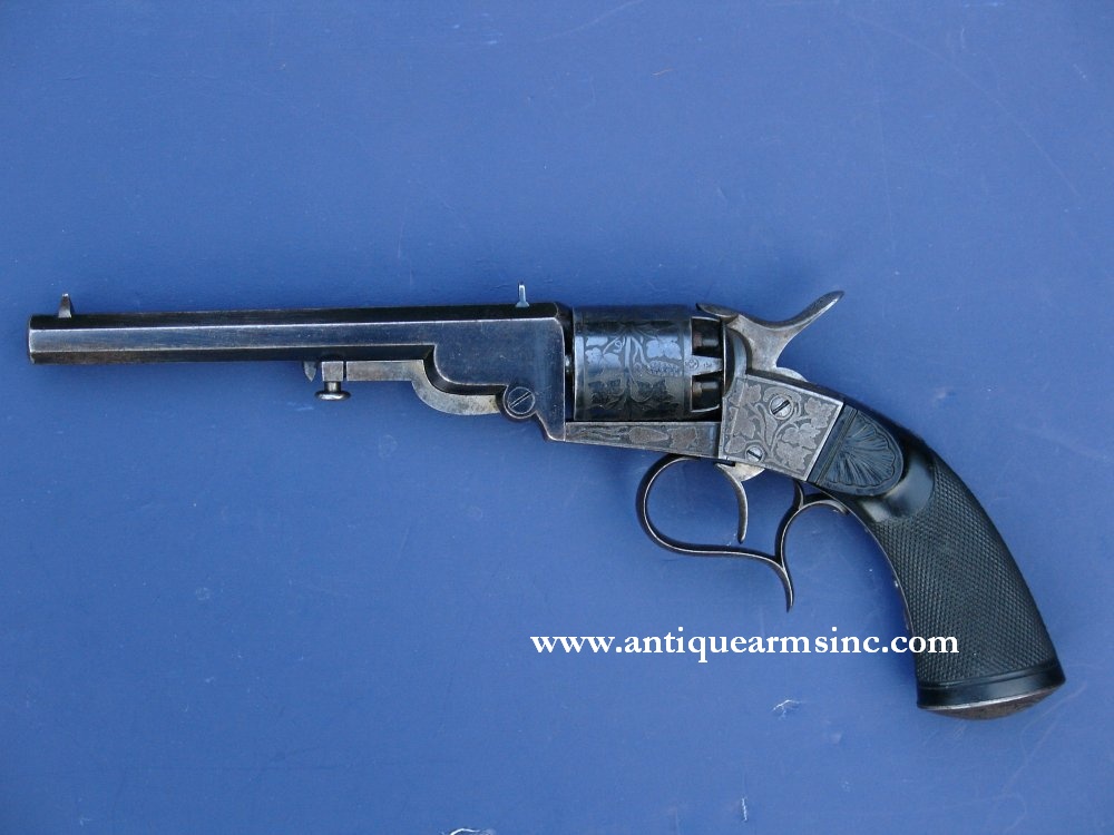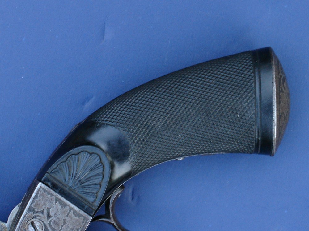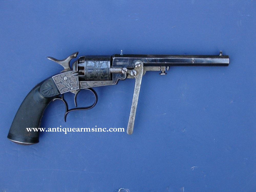 This is a fantastic example of an 1850's era Percussion Revolver manufactured for or by Jean Mathieu Deprez (Joassart) of Belgium. The frame, cylinder, trigger guard, and grip cap are fully relief engraved with grape vines while one-piece ebony grips are finely checkered with hand-carved shells on each side leading up to the frame. In the past, we have tended to stay with American-made revolvers but this Deprez has such an amazing blend of an American influenced gun coupled with European design improvements and Old World craftsmanship, that I couldn't resist. It's similar to a Colt 1851 Navy in that it's a single action with an open top frame design in .36 caliber with an octagon barrel (6-1/4"), but stylistically, it takes a very different approach. Most of the information we were able to uncover on Deprez had to be translated from French but we know that he was the author of no less than ten patents in Belgium from 1857-67...followed by more revolver designs in the 1870's. In addition to his gun innovations, Deprez had an iron foundry located in Herstal, Belgium...which is close to Liege...the epicenter for 19th century European gunmakers.