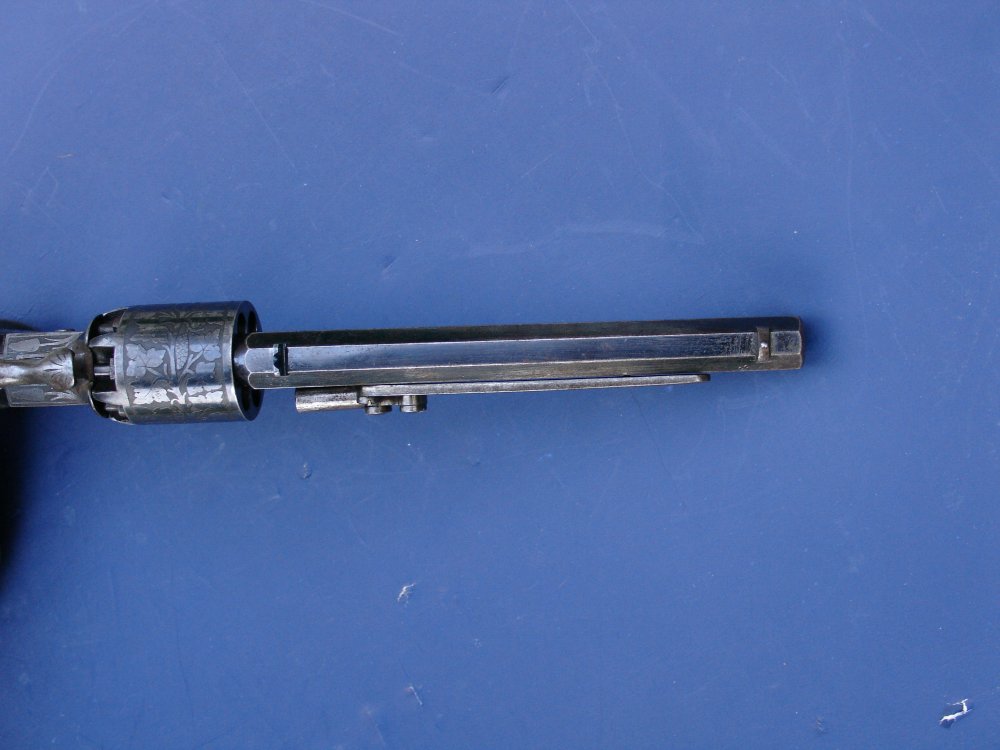 CONDITION: Overall condition is NRA Antique Fine++ to Excellent. The barrel retains 85% bright original blue. Cylinder has 90% finish...while the frame finish has mostly flaked resulting in a light brown patina with blue in protected areas. The release lever, loading lever, trigger and hammer show portions of their original straw-colored tempered finish. Grips are in excellent condition with sharp checkering, no chips, cracks, or repairs.