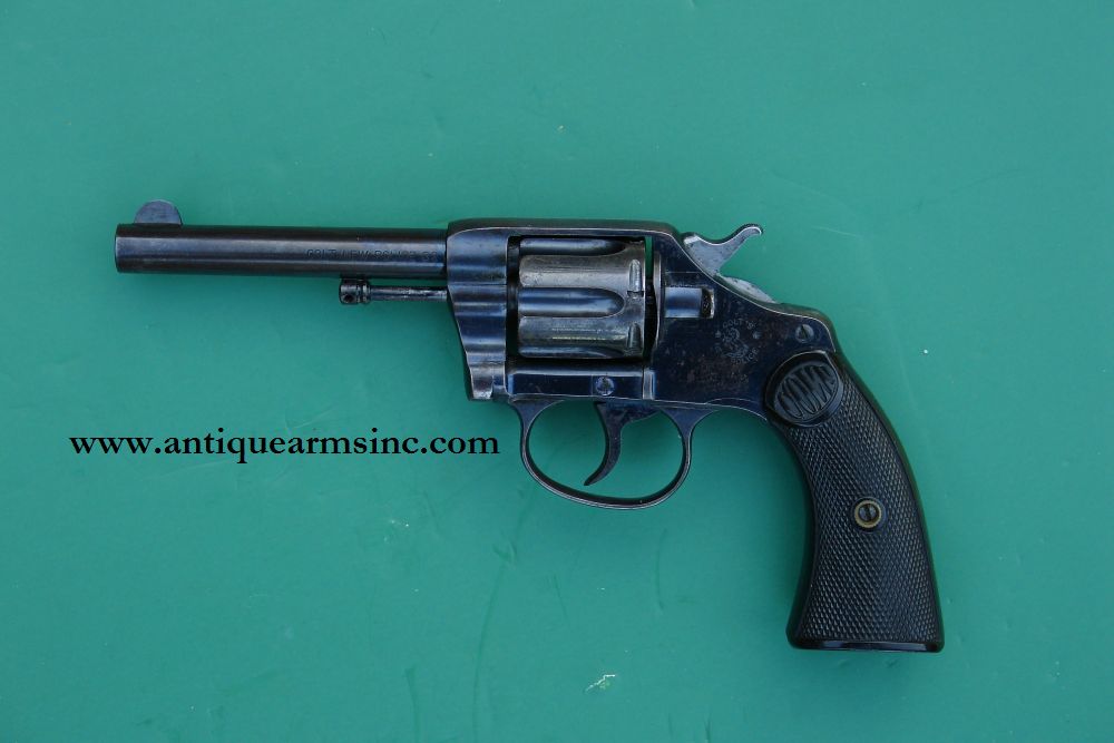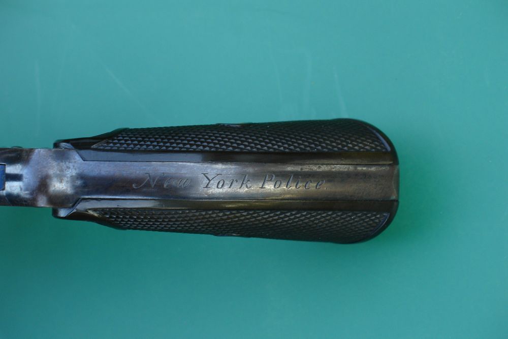 This is an interesting piece of Colt and New York City Police history. Its an antique pre-1898 Colt New Police Revolver in .32 Colt/.32 S&W, 4" barrel with a factory engraved backstrap marked "NEW YORK POLICE". In addition to those markings, the bottomstrap and front strap of the handle has the badge number of the New York Police Officer who carried it. Antique Pre-1898 serial number is in the 2800 range. The Colt Police was the grandfather to the modern double action Police revolver.
