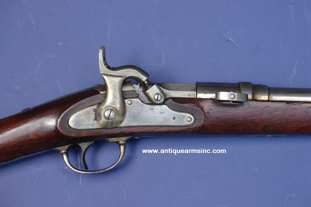 This is a very nice example of a hard-to-find Civil War era Lindner breech-loading carbine Carbine. These were built by Amoskeag Mfg. Co. but only bear Edward Lindner's (the inventor) name and March 29, 1859 patent date on the breech. Its in 58 Caliber and is loading by rotating a collar between the breech/chamber and the barrel. Once rotated 180 deg, an opening in the top of the collar allows the breech (which is spring loaded to pivot upwards about 30 degrees allowing easy access to the chamber (see photos) Best of all, this is the scarcer 1st Type with the saddle ring on the left side of the stock. Of the two types of Lindners, only the 1st type (892 built) was issued to mounted troops during the Civil War.