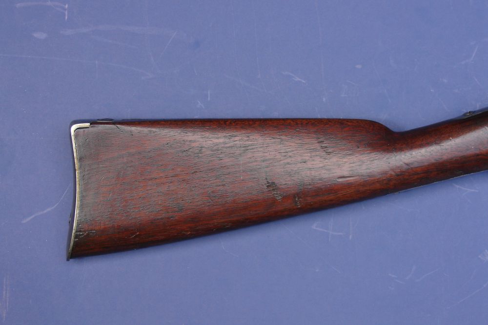 Overall condition of this 1st Model grades to NRA Antique Fine with the metal still bright with old dried grease in the corners. Stock is marked "GKJ" opposite the lockplate in small block letters and a fancier 3 letter cartouche in script with an oval border just in front of the buttplate on the top comb of the wood. The breech is beautifully marked "EDWARD LINDNER'S PATENT MARCH 29. 1859." The lockplate has no markings which is correct on a First Model Lindner. Original sights include a block-style post front sight near the muzzle and a small folding 2 leaf combination rear sight adjacent to the hammer at the breech. Very Good screws throughout. The wood remains in Very Good Plus condition...looks like its seen a little action with a few nicks, dings, and wear around the saddle ring but quite nice overall with strong edges and excellent wood to metal fit. Note the small semi-circle shaped cut-out on each side of the stock for accomodating the round bolt attached to the rotating breech collar. This is also correct. The action works perfectly and the bore appears to be in perfect shape with 3 groove rifling...bright and shiny with machine marks still visible in the grooves. The bolster on the breech shows very little spark/ignition corrosion. The wear on this example seems to suggest issue in the field for a short duration. A very nice and rare example of one of the lesser known types of breechloading carbines used in the Civil War. ...that can traced almost exclusively to two sole Cavalry units. Item# 0859