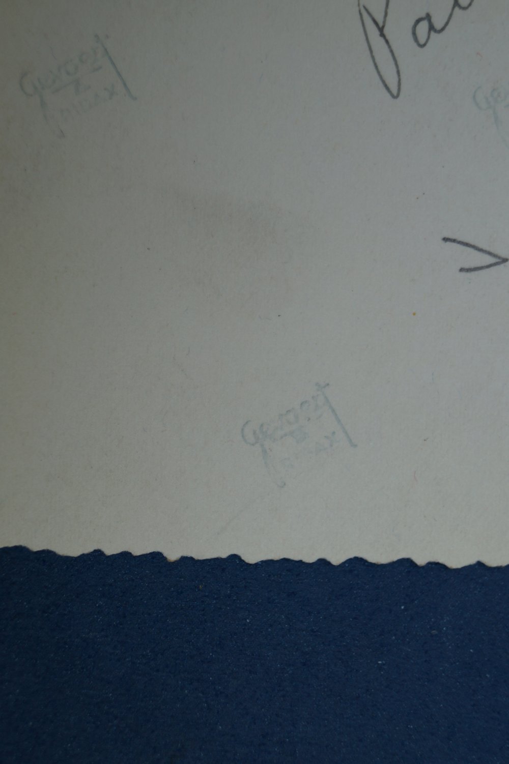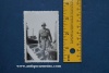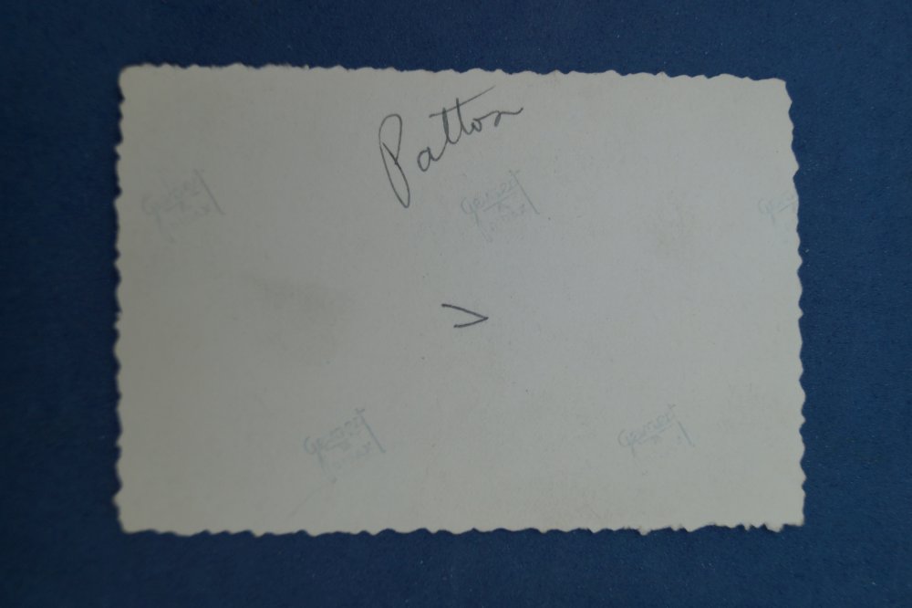 In the photo, Patton is wearing his sidearm on high right hip (this isn't his famous Colt Single Action but probably his Colt 1903 General Officer's Model) with his signature boots, jodhpurs (being ex-US cavalry, Patton was an avid horse rider), officer's belt, tie, green jacket, and his darker green dress helmet liner. When you see photos of Patton where he is on or near the front lines, he's usually wearing his steel pot over a liner. It also appears that he is carrying a small box or briefcase in his left hand. To the forefront of the photograph at bottom right corner, we see a glimpse of a nearby soldier's Colt Model 1911 A1 .45 Automatic Pistol in a US marked Model 1916 holster. To the other side of the scaffolding appears to be an armed guard, another man with a pad and a pencil (reporter?) and if you look very carefully, two more American soldiers in the distance. The image measures 3-1/2 x 2 inches and is in Very Good condition with no tears or discoloration. The back of the photograph is handwritten "Patton" (not his signature) in ink with the manufacturer's name, Gauvert Ridex in several places. We looked this up too and it is pre-war to WW2 Belgian photographic paper which fits the timeframe of the image as the Allies had liberated Belgium and France in 1944. This is spot on for what an American soldier would have been able to acquire in 1944-45 WW2 Europe following the D-Day invasion.
