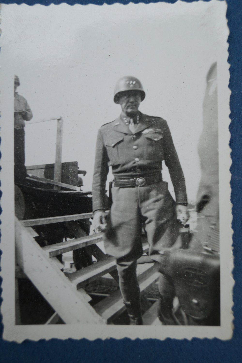 This is a great original photograph of General Patton taken during the last months of World War Two. Patton was one of the greatest American field generals and was also the very first American in the Tank Corps in the First World War. There is a saying that there are many capable of leading a squad, some who can lead regiments, fewer who can lead divisions, but only a handful have the field vision or dynamic intelligence to lead an entire Army into battle. Patton had the rare gift of field vision. He not only lead armies, he did so with ease. In Dec. 1944, he did something no officer had ever done in the history of warfare when he pivoted an entire army of several hundred thousand men off of a front and into the Battle of the Bulge in less than 48 hours. That this was accomplished before the age of modern communications is all the more amazing. It is said he went into the meeting with Eisenhower over how to counter the German offensive into Belgium with at least three pre-formed plans, one of which he would radio to his staff to instantly spring in motion once the meeting concluded. The speed at which Patton's 3rd Army moved off the Siegfried Line in France and into Belgium not only helped relieve the Americans surrounded at Bastogne, it stunned the Germans preventing reinforcements and supplies from reaching Belgium. This saved thousands of Allied lives and shaved several months off the end of the war in Europe.