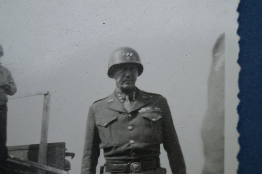 That said, I believe this photograph was taken around this time frame or shortly after as the 3rd Army crossed into Germany for the final push. He appears to be stepping off a set of stairs from some sort of makeshift platform. Coming off the last step, Patton looks straight towards the camera. For a 59 year old in the middle of a war, he looks to be in remarkably good health. We were told by the previous owner that this photograph was taken by a soldier while Patton was inspecting a German rail yard in southern Bavaria around April to May 1945 however, I think this is a little earlier due to his rank insignia. After taking a good look at his helmet and collar of his uniform and realized that he was a three-star lieutenant general at this moment in time indicating that this would have been taken before April 14, 1945 prior to his promotion to four-star general so this couldn't have been taken in May. There is no question this was taken at least a month before V-E Day on May 8, 1945 when the war in Europe was still being fought. My personal guess would be somewhere between Jan. 1945 and April 14, 1945. There is some original footage on Youtube of Patton awarding a medic named Harold Garman the Medal of Honor on March 29, 1945. In it, Patton is wearing what appears to be this exact helmet with the three stars and the circled 3rd Army "A" just beneath the rank. The "A" symbol appears to show up on his fancier helmet used in ceremonies in the early months of 1945. I've looked through a lot of photos of Patton and I can't find any from 1944 of him with it on his helmet. You just see the liner rivet with no "A". Furthermore, he is wearing the identical outfit including his smaller Colt officer's pistol as he is in the photograph. So Jan. to April 45 is the timeframe for this image.