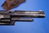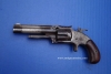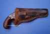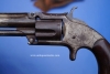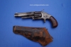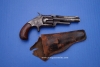 This is a nice early Smith and Wesson Model 1-1/2 Tip-Up Revolver in Caliber .32 Rimfire made from 1868-1875. Serial Number is in the 107,000 range towards the end of production in 1875. Standard 3-1/2" Round Barrel, five-shot fluted cylinder, nickel plated finish, original wooden grips with birds-head shaped handle. This one even has its original holster that's a bit tattered and worn but you see the outline of this little gun in the leather which is kind of neat. Smith and Wesson built the 1-1/2 as an intermediate sized pocket revolver to go between the Model 2 Army (also in .32 Rimfire) and it's smaller Model 1 Pocket Revolver which was in .22 short. The first version of the 1-1/2 came out in 1865. Known as the 1st Issue, it looked like a scaled down No. 2 Army with shorter barrel and grip and came with a solid round cylinder, square grip, and octagonal barrel. In 1868, Smith and Wesson came out with this revolver, the 2nd Issue, which has a much more streamlined rounded appearance. Production lasted until 1875 as the Model 1-1/2 and the Model No 2 were phased out in favor of top break frame in center-fire calibers but in terms of the early days of the American West, the 1-1/2 and its cousins were very much a part of the American Frontier and played an important part in the development of the rimfire metallic cartridge.