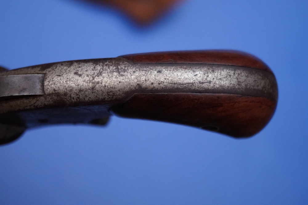 This one is what some collectors call a "Dirty Nickel Gun" where the metal surfaces are a combination of original nickel and a dark brown patina. High end collectors will scoff a bit at these but to more sophisticated types of collectors, they are like art with mother nature painting the canvas through time, age, and use. No two are ever quite alike and many of them have been ruined over the years by people polishing them. This one is about as untouched of an example as you'll find. It has about half of its original nickel remaining on the frame and barrel, maybe 15% nickel on the cylinder with the rest aged to a pleasing smooth soft patina which took many years to acquire. Nice original wood grips with no cracks, chips, or repairs and 35% original varnish remaining. The bore is just fair with decent rifling but a couple noticeable small spots of pitting. Action works correct, barrel latches tight to frame with no wiggle. Nice barrel address on top rib. Matching assembly #s on barrel, cylinder, frame and grips correctly serial numbered to the gun.