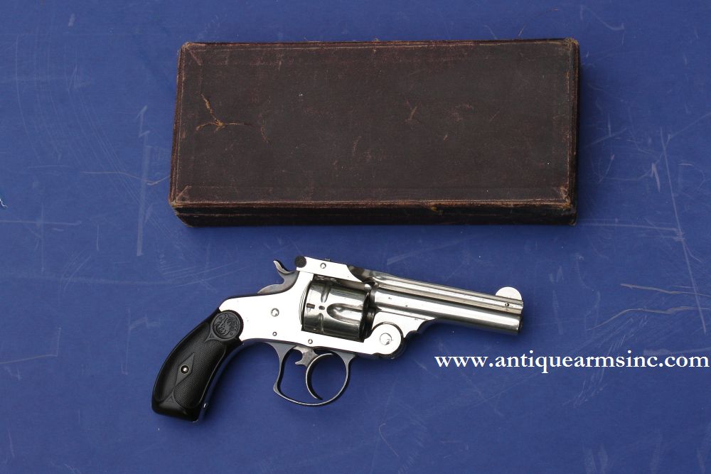 This is a nearly perfect example of a S&W 2nd Model Double Action Revolver in .38 Caliber....complete with its original factory shipping box. Serial number is in the 57,000 range. The 1st and 2nd Models were built from 1880 to 1884. This one is probably around 1882. The only real difference between the two are the are the 2nd Model uses a rounded side (instead of square) plate on the left side of the frame to increase strength. While we tend to think of early models of any design as simple, these early DA's are actually a bit more complicated than the later guns. Rather than one set of stops, the 1st and 2nd Model DA's incorporate 2 rows of stops around the circumference of the cylinder giving these early DA's a very distinctive look with all the machine work and short flutes. When you see them...you know right away..."That's an 1880's S&W Double Action!" Basically, when the hammer is cocked in single action mode or at the height of the double action movement, the cylinder is locked in place by the rear stops. Upon release of the trigger after firing, the forward set of stops kicks in to keep the cylinder from rotating out of position. I guess if you were standing inside of some rotating magnetic vortex, this might come in handy but it was essentially "mechanical over-kill" on the part of Horace and Daniel! Standard nickel finish, checkered hard rubber grips, with 3 1/4" barrel.