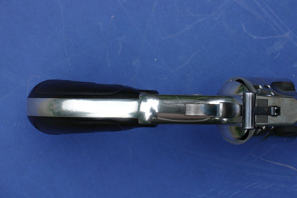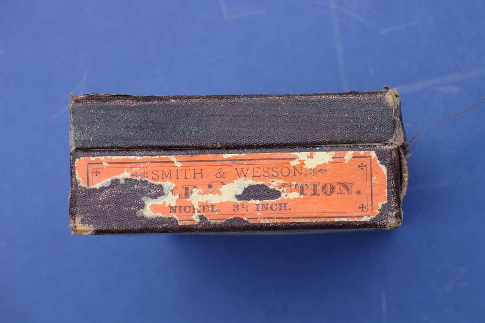 The original box is in good condition complete with the original instructions inside the lid and Orange S&W label on the end which is missing a couple of small spots. The lower portion of the label denotes correctly, Nickel Finish and a 3 1/4" barrel. A few of the corners have been mended along with a couple of small tears in the cardboard. The box is now as solid as a rock and good for another 130 years. These should always be stored away from light and in stable conditions.