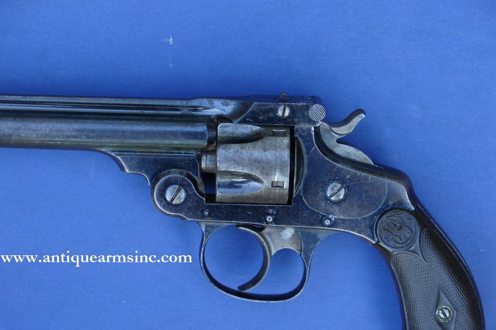 Overall condition is NRA Antique Fine. We checked and this gun has all matching numbers throughout. Barrel patent dates run up to 1889. Overall condition is NRA Antique 65% original blue with the balance worn to a grey patina. Hammer and Trigger still exhibit 25% discernable original case colors . Very Good checkered hard rubber grips with S&W logo. Barrel still locks up snugly to the action. Both Double and Single action are still working. All right, the vast majority of you guys already know all of this...but inevitably, someone who has missed the disclaimer on the first page of this website always wants to know if they can fire it! (Eyes-rolling....sighhhhhh!) For obvious reasons, a good working action should not be construed as an endorsement that this revolver is safe to fire. There's nothing we're trying to hide...this is a good gun...but given its: 1. Rarity 2. Value as a Collectible 3. Being over 110+ years old 4. Constructed of inferior 19th century steel (remember the Titanic with its unsinkable steel hull!) 5. Designed for Black Powder only and not structurally made to withstand the pressures of modern smokeless powder cartridges (yes, there's a very good reason why S&W went from top break frames to solid ones with swing-out cylinders), this is being sold as an Antique collectible only. OK, to 99.9% of you, thanks for bearing with me on that! Bore is in Good condition overall that's still fairly bright with strong rifling with some scattered pitting...typical of a 19th century black powder weapon. A very respectable example of an early blued S&W Pocket DA with a scarce 6" barrel.