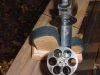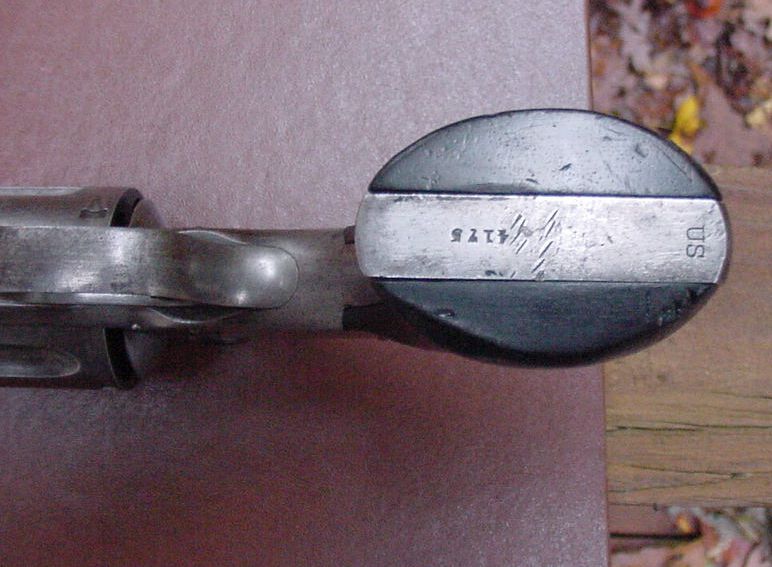 Overall condition is NRA Antique Very Good Plus with a very smooth light grey brown patina with sharp edges, excellent markings, and no pitting. There are traces of original blue around the screws with quite a bit of original blue remaining inside the frame and on the back of the cylinder when the action is opened up. Nice mechanics and a very good bore that is still slightly bright with good lands and grooves and just a few minor pits. "US" stamped on bottomstrap with serial number. This particular gun is in the 4100 serial range with all matching numbers except the right grip which is an original Schofield grip but numbered to a different gun. The left grip still has a good legible cartouche with US inspector's initials "CW". Original sights. A nice sharp example of a US military Schofield revolver.