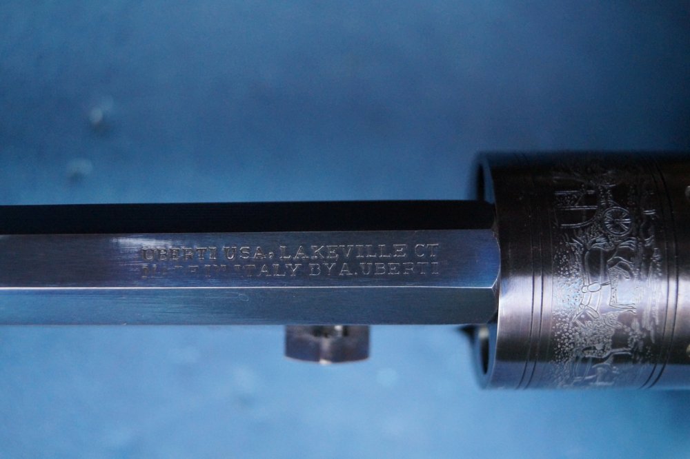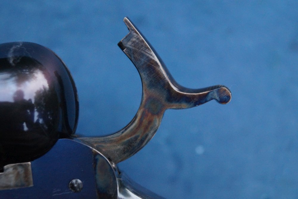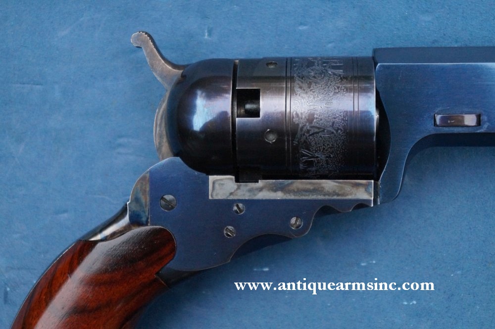 This is a nice Uberti Model 1836 Paterson Percussion Revolver that is unfired and still in its original box. Standard .36 caliber with octagon barrel. Comes with loading tool. These are really well made. My gunsmith has worked on a number of original Colt Patersons over a span of many years so I value his opinion when it comes to the subject. He says that these Uberti's are the closest to the original Colt Paterson out of all the production replicas. Unfortunately, Uberti only built the Paterson for a few short years and it seems relatively few were made. They can be a challenge to find on the market today. This one has the special order charcoal blued finish and which was closer to the original 19th century heat charcoal blued finishes than the modern blue/black finish which came as standard. Nice case colors on the hammer and frame plate. This one is 99.9% Mint and has never been fired.
