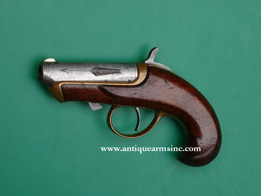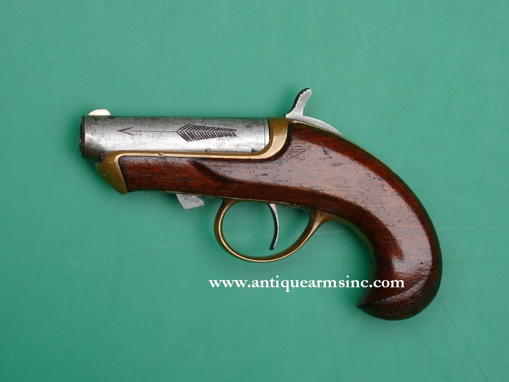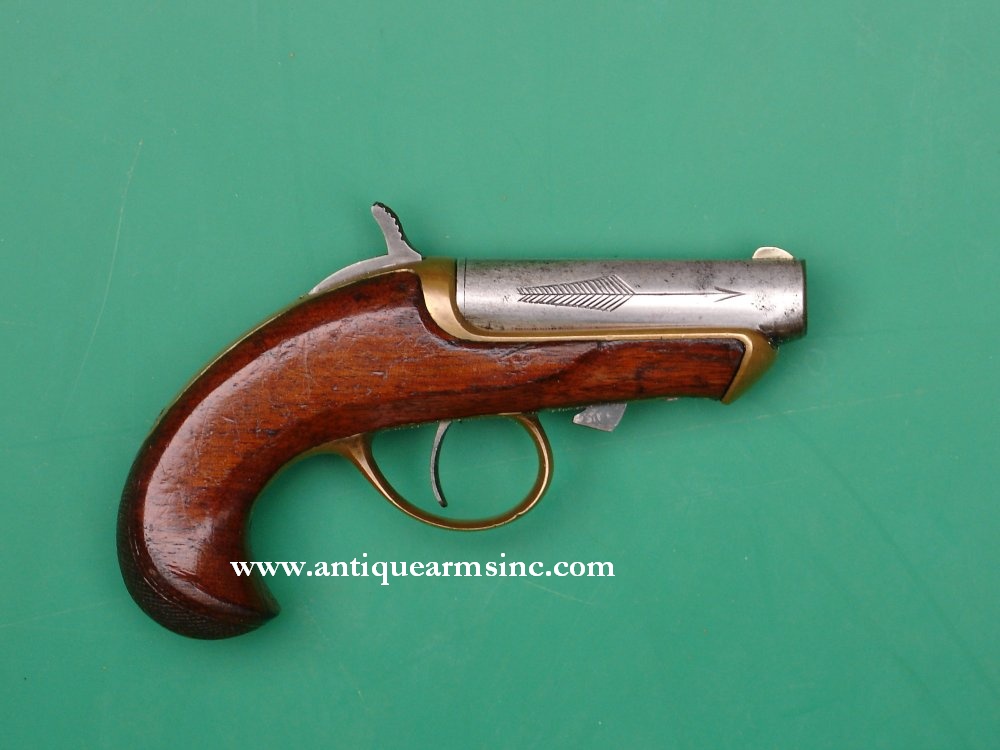 Overall condition is NRA Antique Very Good. The metal is in great shape...the barrel showing only original finish in external areas with sharp edges and clear markings. This includes two fantastic engraved arrows running down each side of the barrel...a distinctive feature found on many surviving examples of Williamson Deringers. Williamson's Oct. 2, 1866 patent date is located on the top flat of the barrel. The brass frame has aged to a perfect and even patina with original silver plating in internal areas. Barrel is numbered to the frame. The walnut grip is in Fine condition with no damage and fairly minimal handling wear. The original wraparound checkering is still sharp and has never been re-cut. The mechanics are in very nice shape. The auxiliary chamber is still with the gun. It's very old, its condition consistent with that of the gun itself and appears to be original. The bore is Excellent...bright and shiny with strong three groove rifling. This fantastic little pistol comes to us from an old collection. These are seldom found with the auxiliary percussion chamber! An impressive gun in both design and condition.
