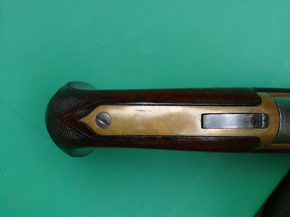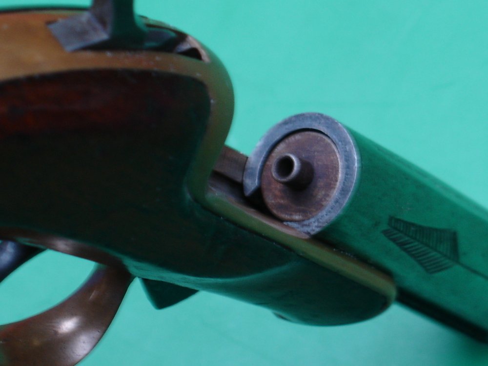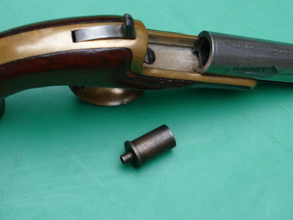 The design shows a clear likeness to Henry Deringer's original percussion single shot pistol from the 1840's...especially in size, profile, and single piece stock. It even uses Deringer's distinctive wrap-around checkering on the grip handle. Internally though, the gun is a completely different animal mechanically speaking. Williamson's design is a true breech loading cartridge gun...but he does a fantastic job of hiding the technology inside the traditional shell of the Deringer tradition. Instead, everything is internally mounted by incorporating an internally mounted one piece brass frame inside the traditional style handle and obviating the external hammer and lockplate mechanism. Instead of the wood being the central mounting point for various components, the frame that houses a centrally mounted hammer, mainspring, firing mechanism, locking mechanism for the barrel and the barrel itself. The barrel design is about forty years ahead of its time...it's fashioned like the slide on a semi-automatic pistol...the frame acting as a bed with mortised grooves to allow the barrel to function as a sled back and forth to gain access to the breech. This is pretty incredible stuff for the 1860's. It makes one wonder if early designers of the automatic pistol like John Browning had a chance to study this design thirty years later. Williamson hid this fantastic design by mounting it into the Deringer profiled wooden stock...quite an understatement for such a well thought out frame. Instead, Williamson must have been content to stay within the traditional dimensions and aesthetics of Henry Deringer's famous and oft-copied design. Williamson even found a way to fire the gun in percussion mode...another smart move that must have eased the worries of customers, many of whom were probably purchasing their first cartridge gun back in the 1860's. Provided with each gun was an auxiliary chamber...a steel cup with a percussion nipple centrally mounted...which acted in similar fashion to a central fire primer found in cartridges today. To achieve this, there are two points of ignition...one through a rimfire firing pin located on the top of the hammer, the other through a small hole in the back of the frame where the body of hammer would make contact with the percussion cap. Unfortunately, this innovative design was only manufactured for approximately four years (1866-70) when Colt Patent Firearms bought out National and dissolved the company. The only National product to survive was the No. 2 Single Shot Deringer which was added to the Colt product line...also in .41 caliber.