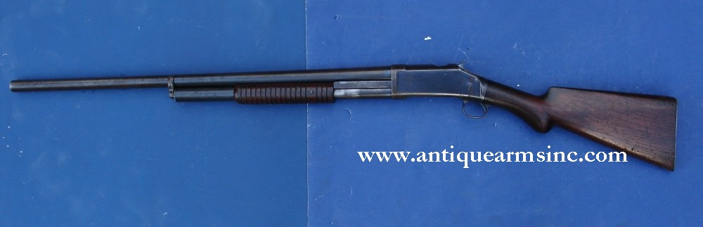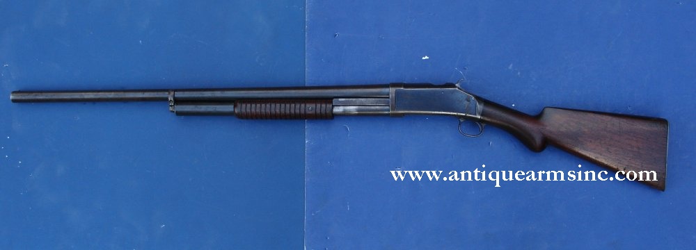 This is an early Model 1893 Winchester pump action shotgun with the type "A" frame. The serial number is in the 3,900 range. Factory records indicate this gun being received in the warehouse on October 17, 1893.