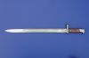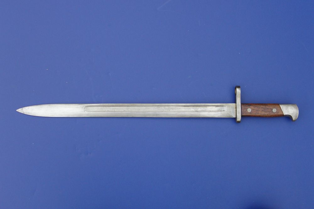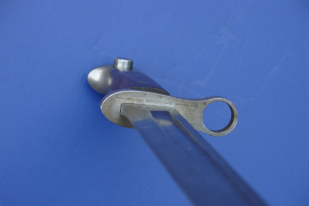 This is a scarce Model 1895 Winchester musket bayonet. They will also fit the very rare Winchester Model 1907 rifle with bayonet attachment. The front face of the hilt is marked "WINCHESTER REPEATING ARMS. CO.". These blade measures 16" long and 20 9/16" overall. Good walnut grips are in vg condition. Blade is still fairly bright with no pitting or nicks. Good+ to VG condition overall.