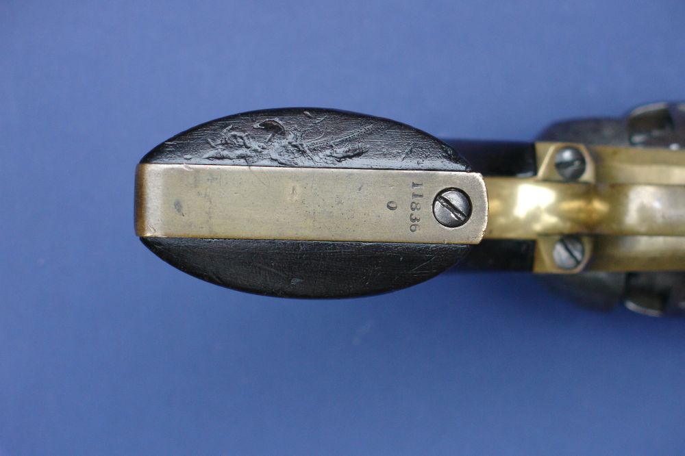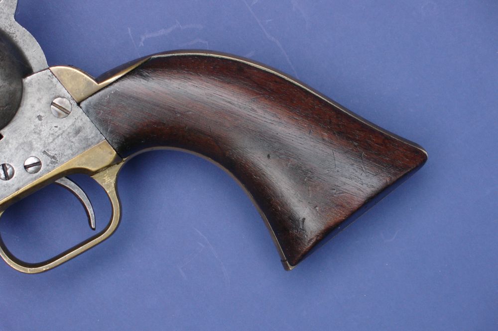 Overall condition is NRA Antique Good+ to VG- with good clean lines, sharp edges, good markings, and nice screws. The metal is has aged to a light grey brown patina that is fairly smooth but mixed with some light areas of scatterered corrosion and pitting like it lived near the ocean in salty air. For a Dragoon, it shows remarkably little usage. Frame shows traces of silvered out case colors in protected areas. The cylinder has some portions original scene...its seems less worn as it is obscured by light peppery corrosion. In spite of this, it has nice edges, uncorroded nipples, and has somehow survived with all six safety pins intact...a little distressed but all are still standing. The grips are in VG+ shape as well with no chips, cracks, or repairs. Nice wood to metal fit that's just a hair undersized from natural shrinkage over the past 150+ years. Excellent mechanics with the cylinder still indexing and locking up properly. Nice smooth chambers and a near excellent bore with strong rifling that's mostly bright that's a tad frosty towards the muzzle. A good example of a nice Colt Dragoon.