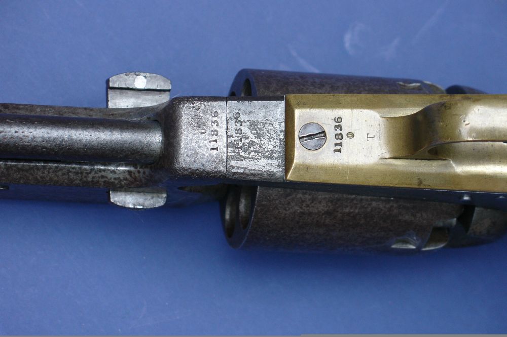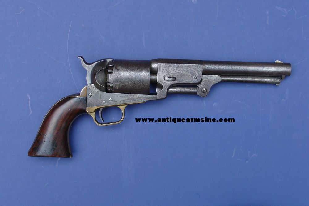 This is a good solid example for a Colt Dragoon Revolver. Standard 3rd Model in .44 Caliber with 6 shot cylinder, 7 1/2" barrel, and round trigger guard. All matching numbers including the iron wedge. The serial number is in the 11,000 range which dates its manufacture to 1851, the first year of manufacture for the 3rd Model. The left side of the frame is marked "COLT'S PATENT" <over> "U.S." denoting purchase by the US Government. Several of the parts also bear initials of US Sub-inspectors. Top of barrel lug is marked, "ADDRESS SAML COLT NEW-YORK CITY"