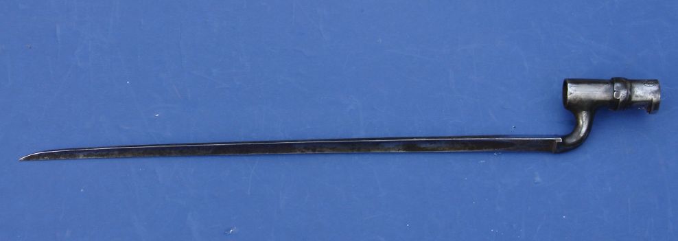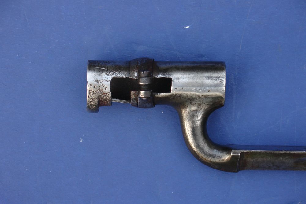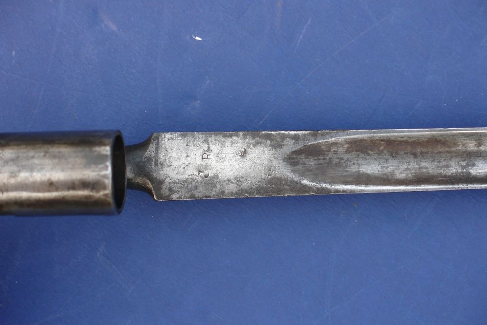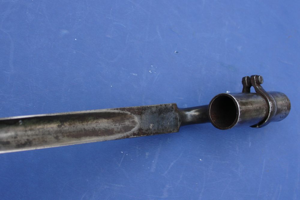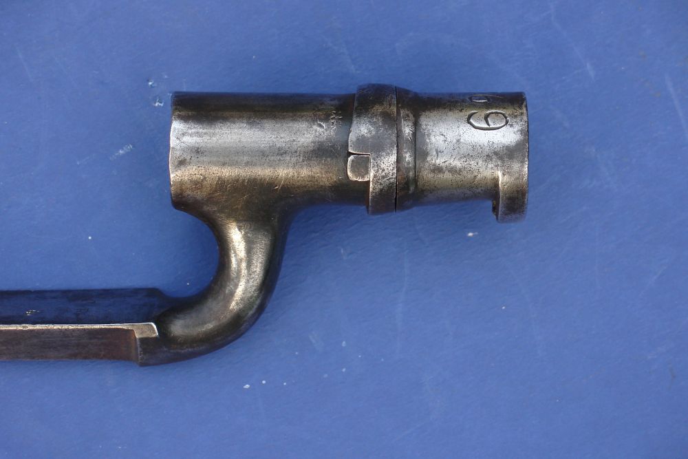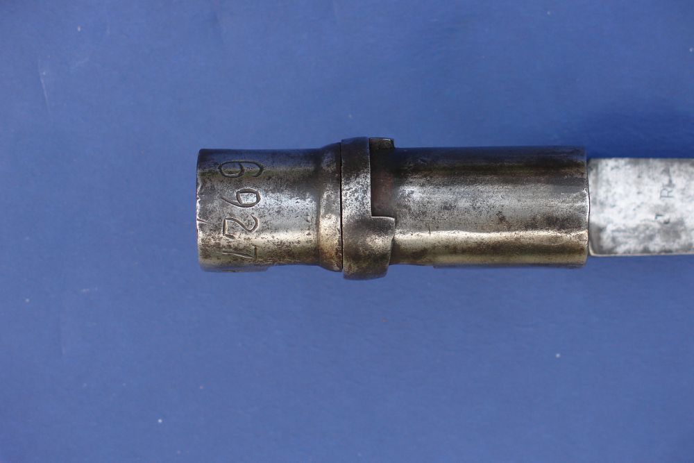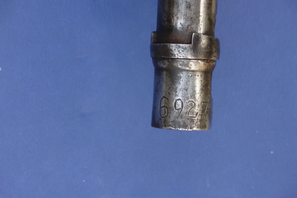 Over the years, we have had a number of Confederate JS Anchor Marked Enfields muskets with blockade numbers. We've even had a couple with matching numbered ramrods. However, this is the first time we've been able to offer a numbered bayonet for one of these guns. The number engraved at the base of the sleeve is "6927" and would have been mated and crated with a Pattern 1853 3 band Musket bearing the same number. Its believed that a good many of these first JS Anchor marked guns were shipped aboard the ships Fingal, Gladiator, and Economist