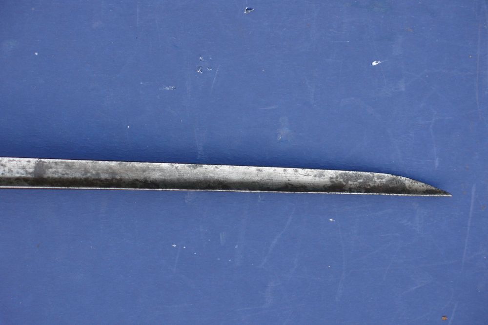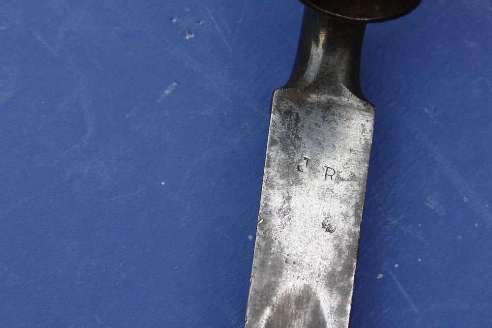 As to condition, this bayonet wood grade as Good+ but due to some restoration/repair work, we will just call it NRA Antique Fair or "wounded". Such is the case with a great many Confederate weapons as they were so often used beyond the breaking points of their design both during the war as instruments of War and afterwards as tools on farms throughout the South. The metal is in good shape overall with a fairly nice blade and good sharp contours. The metal sleeve or tube that a goes around the barrel has an old repair where someone has welded a split (see photos). My guess is that this area was badly bent or possibly crushed and someone put in a valiant effort to save it. The bottom of the blade is also marked J.R. with a double struck letter "c" nearby. If you've always wanted a real Confederate bayonet for you JS Anchor Enfield, but could never find one or afford one, this one should do nicely on display with your collection.