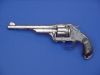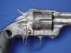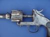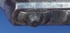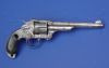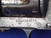 | This is a standard late production single action Merwin & Hulbert with 7" barrel, conventional cylinder flutes, birdshead grips, marked "CALIBRE WINCHESTER 1873" aka 44-40.  The left side of the barrel has the tiny "HOPKINS & ALLEN" markings, the firm who built these revolvers for the Merwin & Hulbert Company.  The top of the barrel has the Merwin & Hulbert address with patent dates running from JAN 24...1874...THROUGH MAR 6, 77.  Markings are a little worn on the barrel but 100% legible and not dished out...just show honest wear. Original nickel finish has flaked and worn to approximately 25% with the balance being a mixture of light grey patina and some small patches of light pitting due. The front sight has a very thin brass blade inserted to the extreme top which doesn't distract.  The right hard rubber grip has a chip where half of the round upper panel has been chipped out...otherwise, grips are solid with decent checkering.  Action works and the the suction on the barrel assembly during the unloading process is quite remarkable...standing upright...it almost floats down to the recoil shield...always nice to see on an old Merwin like this.   Good bore with a good rifling and a few scattered pits.  Good screws and nice hammer checkering.  A decent example of the Single Action Merwin which was very popular out West and throughout Mexico during the latter part of the 19th century.  SOLD  |