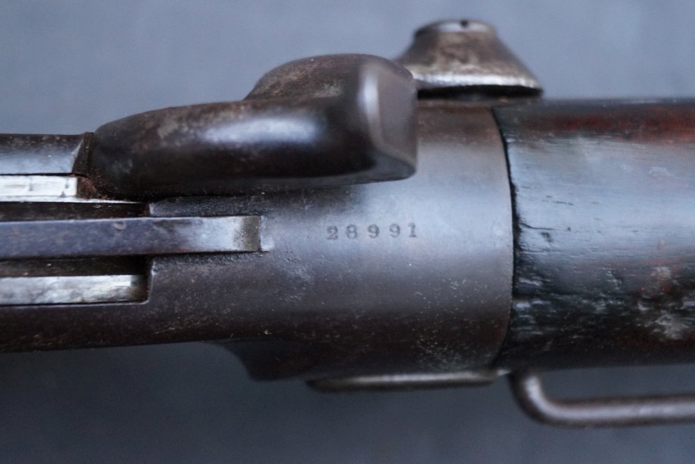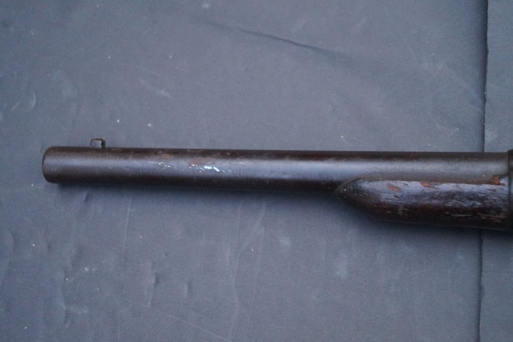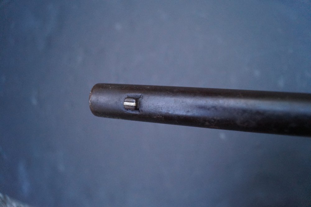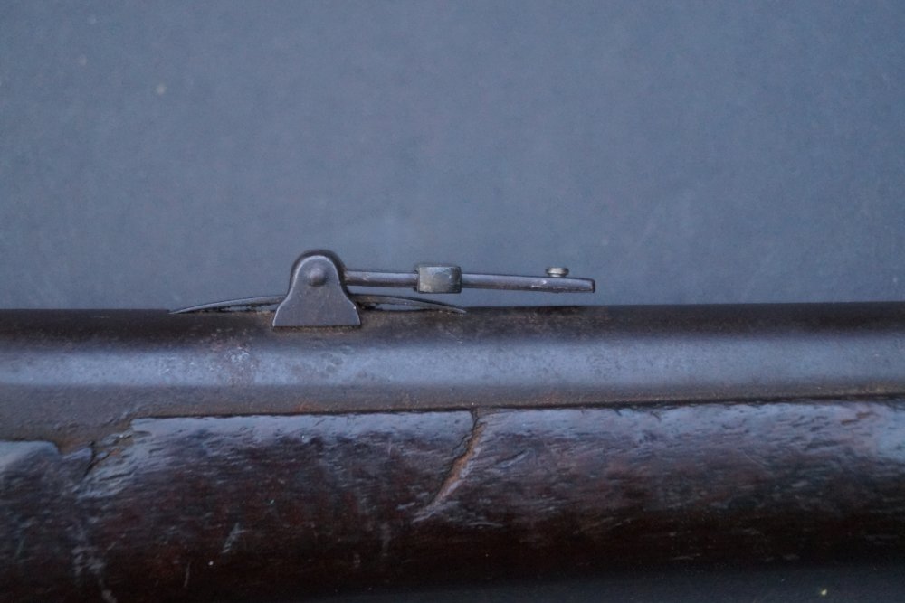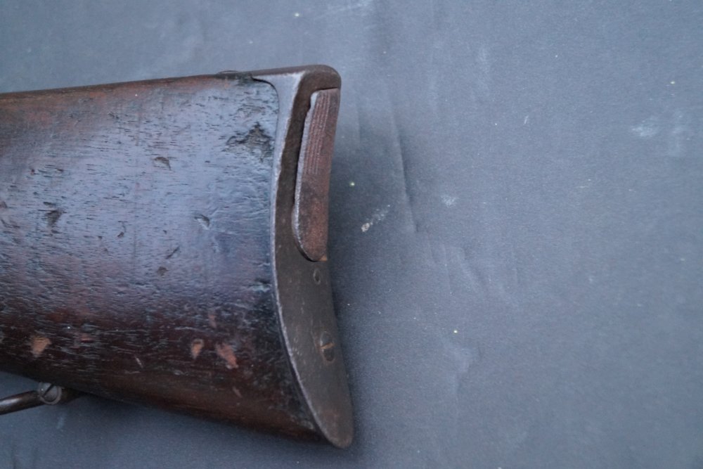 Perhaps that was the case here with this seven shot Spencer. That said, when we found this carbine, the seven round detachable magazine tube which fits in the buttstock was missing and the barrel had been cut several inches long ago with a small front sight installed...this was a long time ago.