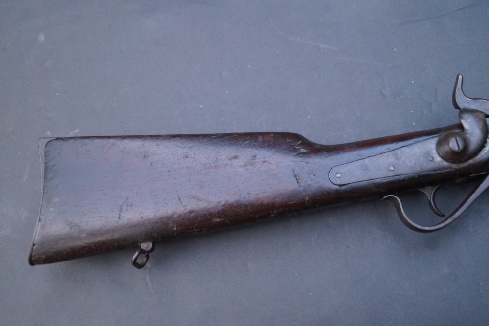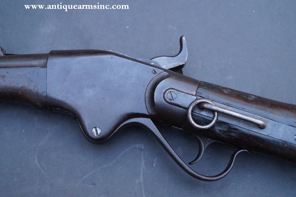 Overall Condition grades to NRA Antique Good as altered. The metal has a dark smooth patina with no pitting. There is a small streak of light very old blue paint on the left side of the barrel from back when people used to paint their ceilings either light green or blue to keep birds or bugs from nesting...common in this region in old homes. The markings are good. The top of the frame reads: SPENCER REPEATING. (a bit light at the front from a worn roll die) <over> RIFLE. BOSTON MASS. <over> PAT'D MARCH 6. 1860. The serial number is in the 28,000 range and it looks to be a pure 1860 with no post war gov't alterations such as the stabler cut off. Bore has its correct original six groove rifling, original rear sight, saddle barrel, and sling swivel on the base of the buttstock. The action appears to be in good working order. Hammer still has both half and full cock positions. The stock has plenty of dings, scratches, and dents from the war along with a slight oval wear spot on the left side from the metal sling attachment issued to Union cavalrymen. The wood is solid however with no cracks and has never been sanded or refinished. In fact, both inspection cartouches are visible on the left side of the stock just behind the sling bar. As stated earlier, when we found this little carbine, it was missing its seven shot magazine but we were able to pick up an original circa 1863 production (perfect for this carbine) that is a perfect match in terms of age and wear. It fits and goes perfectly in the gun. See photos. Interesting example of an early Spencer Carbine that was lost in Georgia during the 1864 Atlanta Campaign.